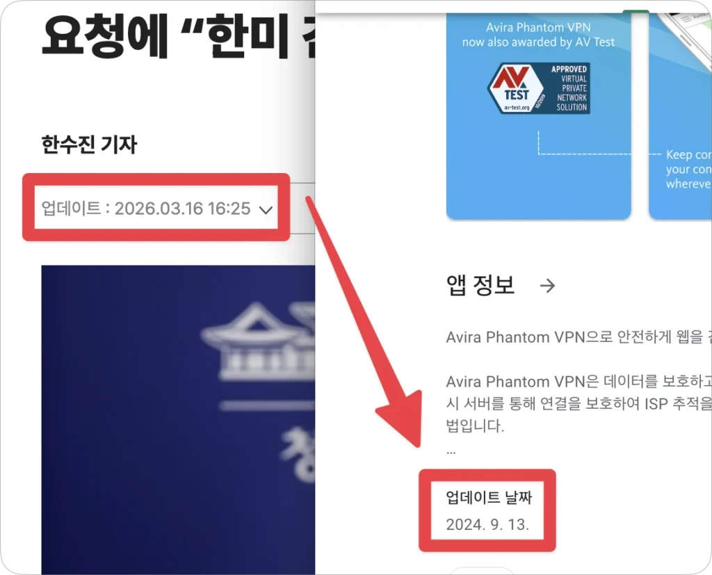 Avira VPN 첫 리뷰를 올린지 18개월 정도가 지난 뒤에 다시 한 번 더 확인해봤습니다. 위 이미지의 왼쪽 기사는 날짜를 비교하기 위해서 겹쳐 놓은 것입니다. 안드로이드 앱 업데이트 날짜가 2024년 9월 13일에 멈춰있습니다. Avira도 출시 이후에 현실을 직면하고 키워나갈 생각을 접은 것으로 보입니다.