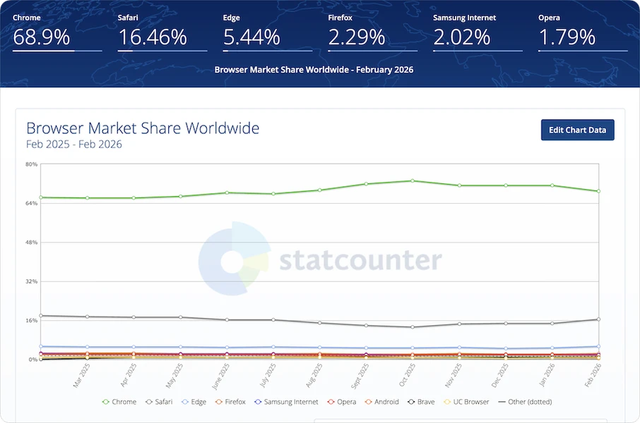 이건 2026년 3월 기준입니다. 2024년보다 오히려 크롬은 소폭 더 올라갔네요. Safari는 오히려 내려갔네요.