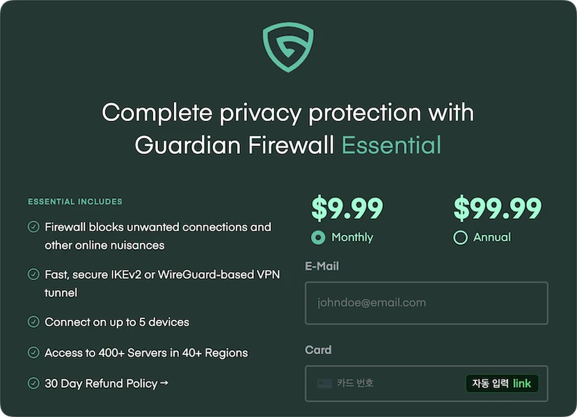 유료 플랜은 Guardian Pro 인데 가격이 $9.99로 Brave VPN과 동일합니다.