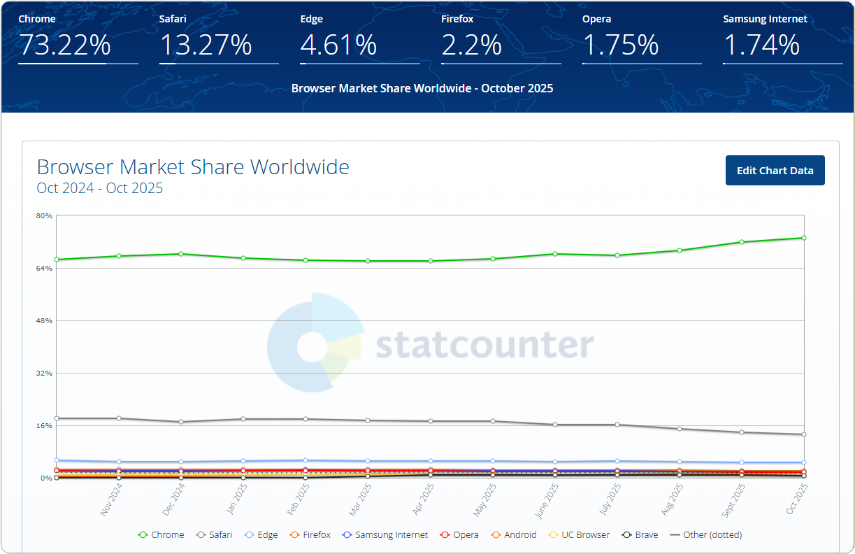 2025년 11월 29일 웹브라우저 점유율 업데이트 했습니다. 오히려 2.2%로 더 떨어졌네요..