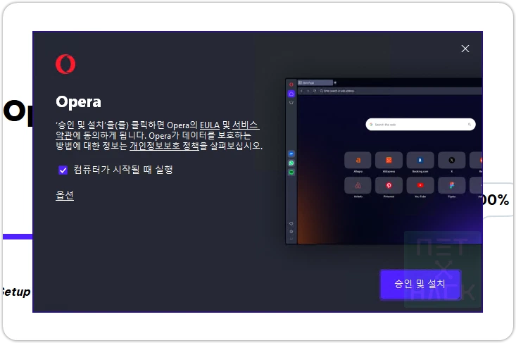 오페라 브라우저 설치할 때 그냥 ‘동의 및 설치’ 누르지 마시고 옵션부터 꺼주세요.