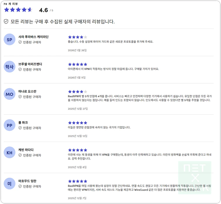 구매자들의 평이니 거짓은 아닐거라 생각합니다. 다만 아직도 와이어가드가 포함되지 않은 것으로 보이네요. Wireguard는 현재 VPN 업계에서 거의 표준과 다름없는 위치에있으며 가장 많이 사용됩니다. 일반적인 VPN 회사들은 오래전부터 기본 프로토콜로 제공하고 있습니다. 이 말은 RealVPN이 A급 서비스는 아니라는 뜻이기도 합니다.